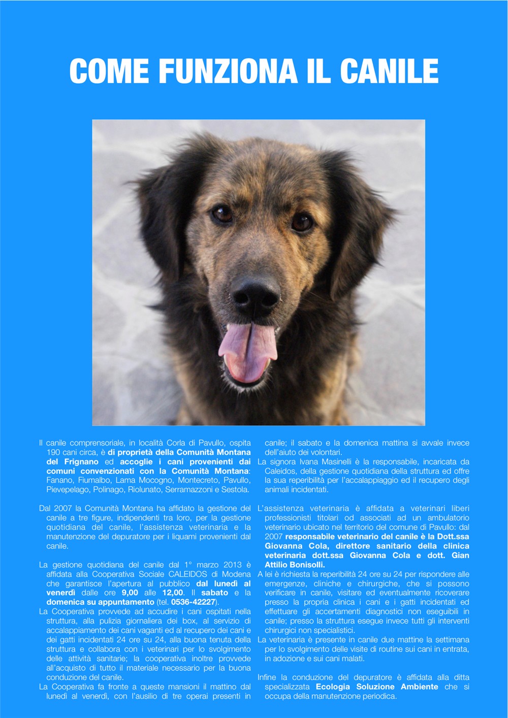 Di proprietà dell'Unione dei Comuni del Frignano, accoglie i cani provenienti dai comuni convenzionati con l'Ente: Fanano, Fiumalbo, Lama Mocogno, Montecreto, Pavullo, Pievepelago, Polinago, Riolunato, Serramazzoni e Sestola.