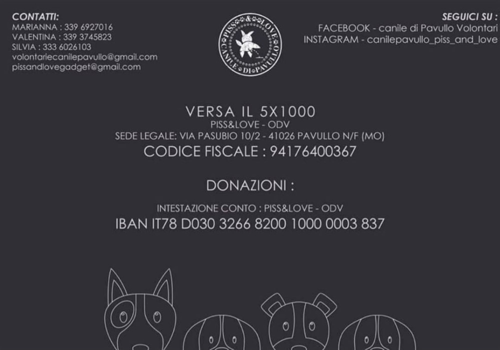 | Note | Grazie all'attività prestata dalle volontarie dell'Associazione pavullese PISS&LOVE - ODV, che si sono prodigate nelle adozioni degli ospiti del canile, il numero di cani presenti nella struttura è sceso a 80 (dato agg. gennaio 2024) |